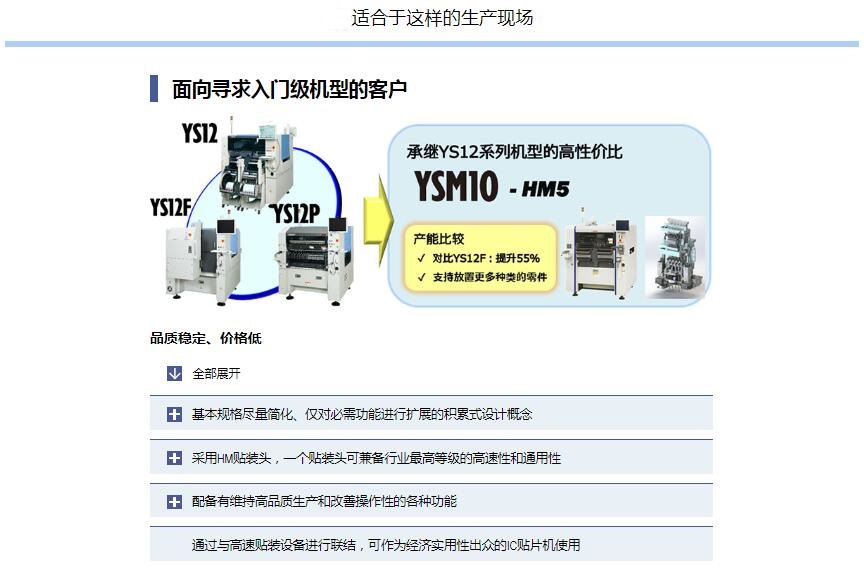 YSM10 小型高速模塊貼片機(jī)1.兼?zhèn)涓咚傩院屯ㄓ眯浴⒃谕墑e機(jī)型中實(shí)現(xiàn)更高水平貼裝能力的YSM系列入門級貼片機(jī)。2.以三個“1”為特征、達(dá)到極致的基礎(chǔ)型貼片機(jī)。3.可靈活支持各種生產(chǎn)現(xiàn)場。4.可確保穩(wěn)定生產(chǎn)的各項功能。