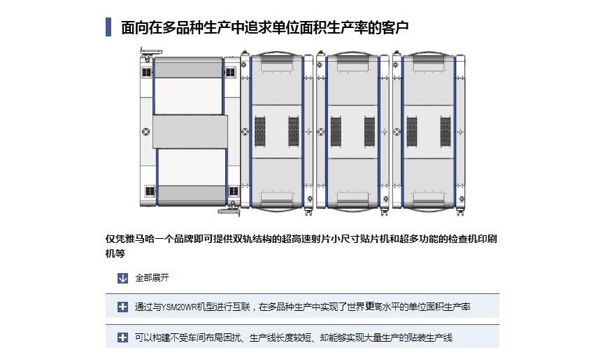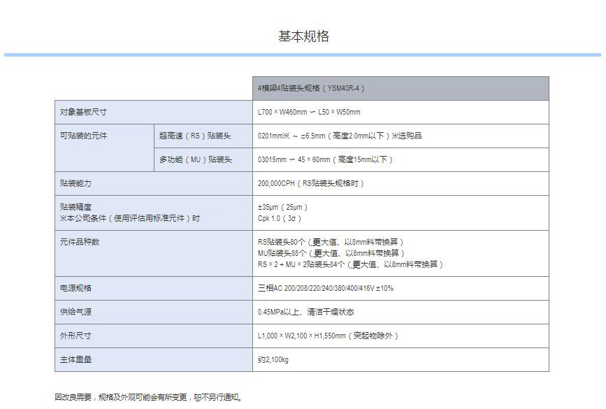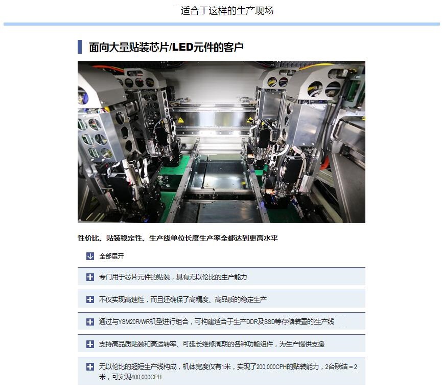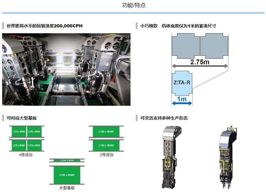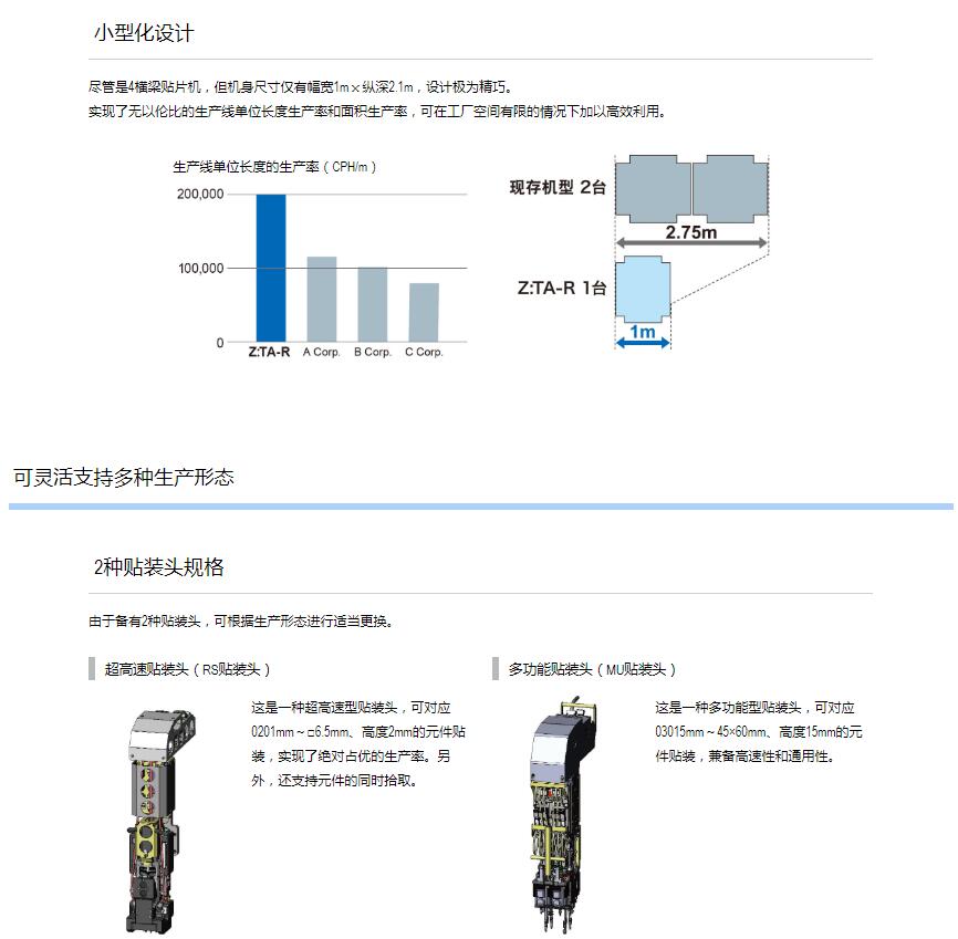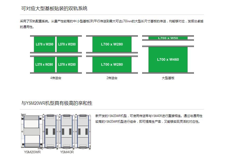 Z:TA-R YSM40R超高速模塊貼片機 1.采用小巧的平臺構造,達成了世界更高水平的貼裝速度20萬CPH※,實現了生產率的全面革新。2.全球更高生產率。3.靈活支持多種生產形態。4.支持高品質貼裝和高運轉率的技術。※:與4橫梁/4貼裝頭的同級別貼片機在更佳條件下的貼裝能力(CPH)對比。基于2016年4月本公司的調查結果。