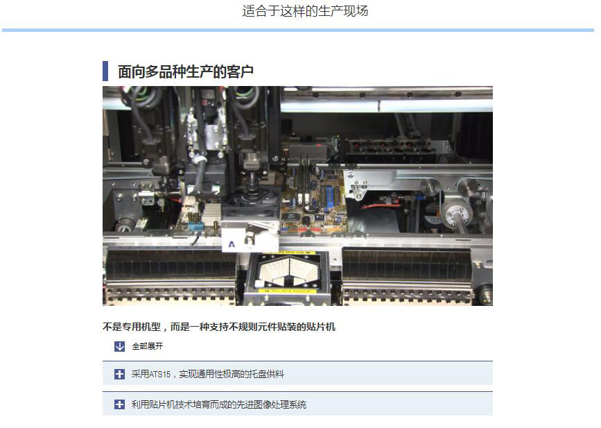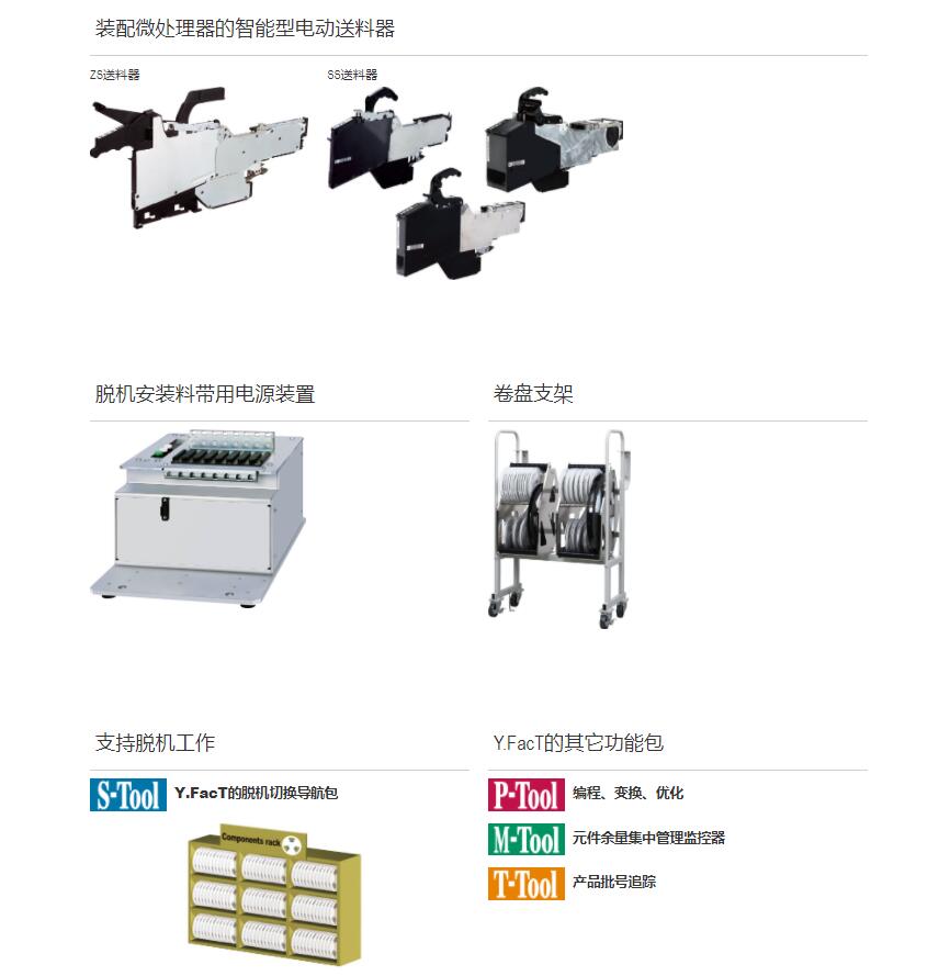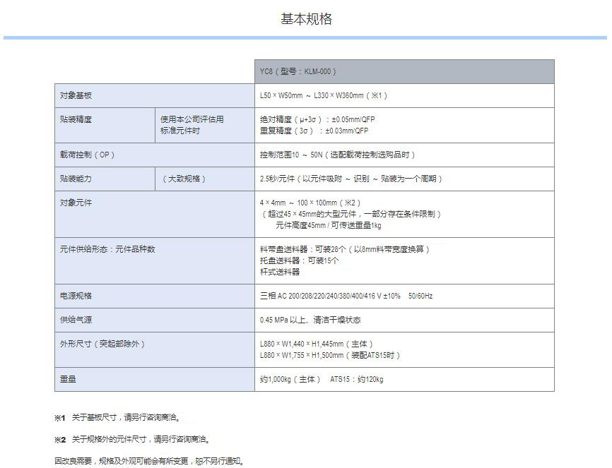 YC8 支持大型、不規則元件的小巧型模塊式貼片機 1.可貼裝較大尺寸達100mm×100mm、高達45mm的元件。2.支持貼裝重達1kg的元件,還具備壓入元件的功能。3.機身僅寬880mm的小型化設計,可大限度地有效利用空間。4.支持可裝15張托盤的自動更換式托盤供給裝置 ATS15。5.支持SS型電動送料器與ZS型電動送料器。