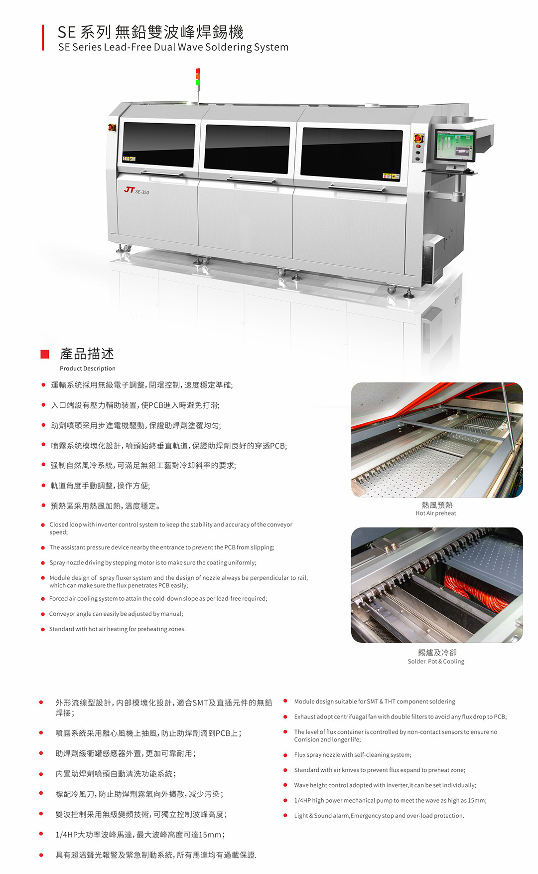 外形流線型設計,內部模塊化設計,適合SMT及直插元件的無鉛焊接。 噴霧系統采用離心風機上抽風,防止助焊劑滴到PCB上。 助焊劑緩沖罐感應器外置,更加可靠耐用。 標配冷風刀,防止助焊劑霧氣向外擴散,減少污染。 雙波控制采用無極變頻技術,可獨立控制波峰高度。 1/4HP大功率波峰馬達,更大波峰高度可達15mm。 具有超溫聲光…