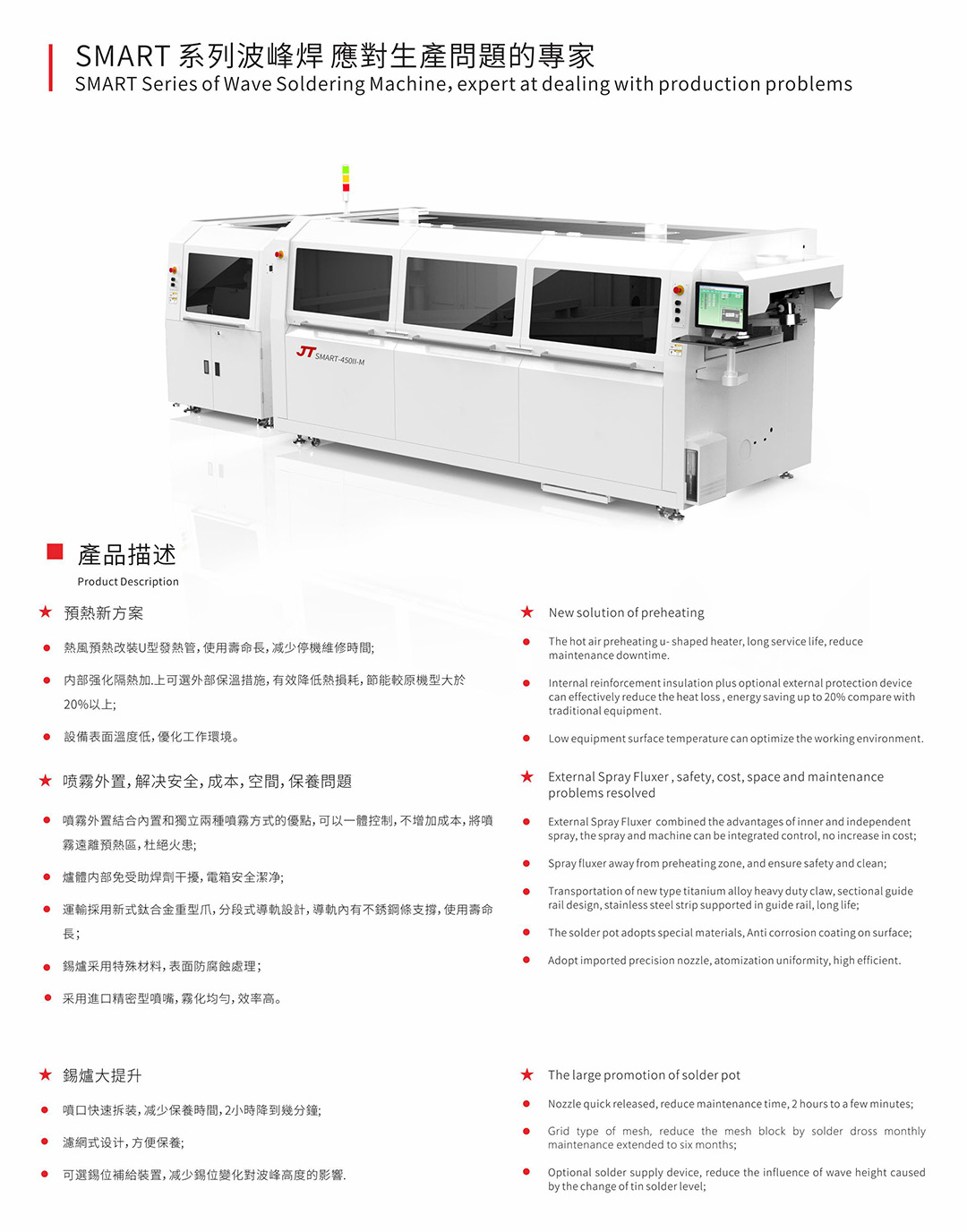 噴霧外置結(jié)合內(nèi)置和獨立兩種噴霧方式的優(yōu)點,可以一體控制將噴霧遠(yuǎn)離預(yù)熱區(qū),杜絕禍患。爐體內(nèi)部免受助焊劑干擾,電箱安全清潔。為四段預(yù)熱節(jié)省空間的同時減少前段接駁臺的使用。外置噴霧導(dǎo)軌角度可調(diào),代替入口接駁功能。熱風(fēng)預(yù)熱改裝U型發(fā)熱管,使用壽命長內(nèi)部強(qiáng)化隔熱加上可選外部保溫措施,有效降低熱損耗。設(shè)備表面溫度…
